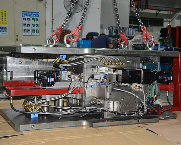 BMW end cap 1000T大型雙色模具,前模頂出需要開模同時沿分型面頂出,合模需要分型面推前模頂出系統回位,經過我們工程團隊前期跟客人提出的有效建議對產品的優化,結果模具試模一次成功。